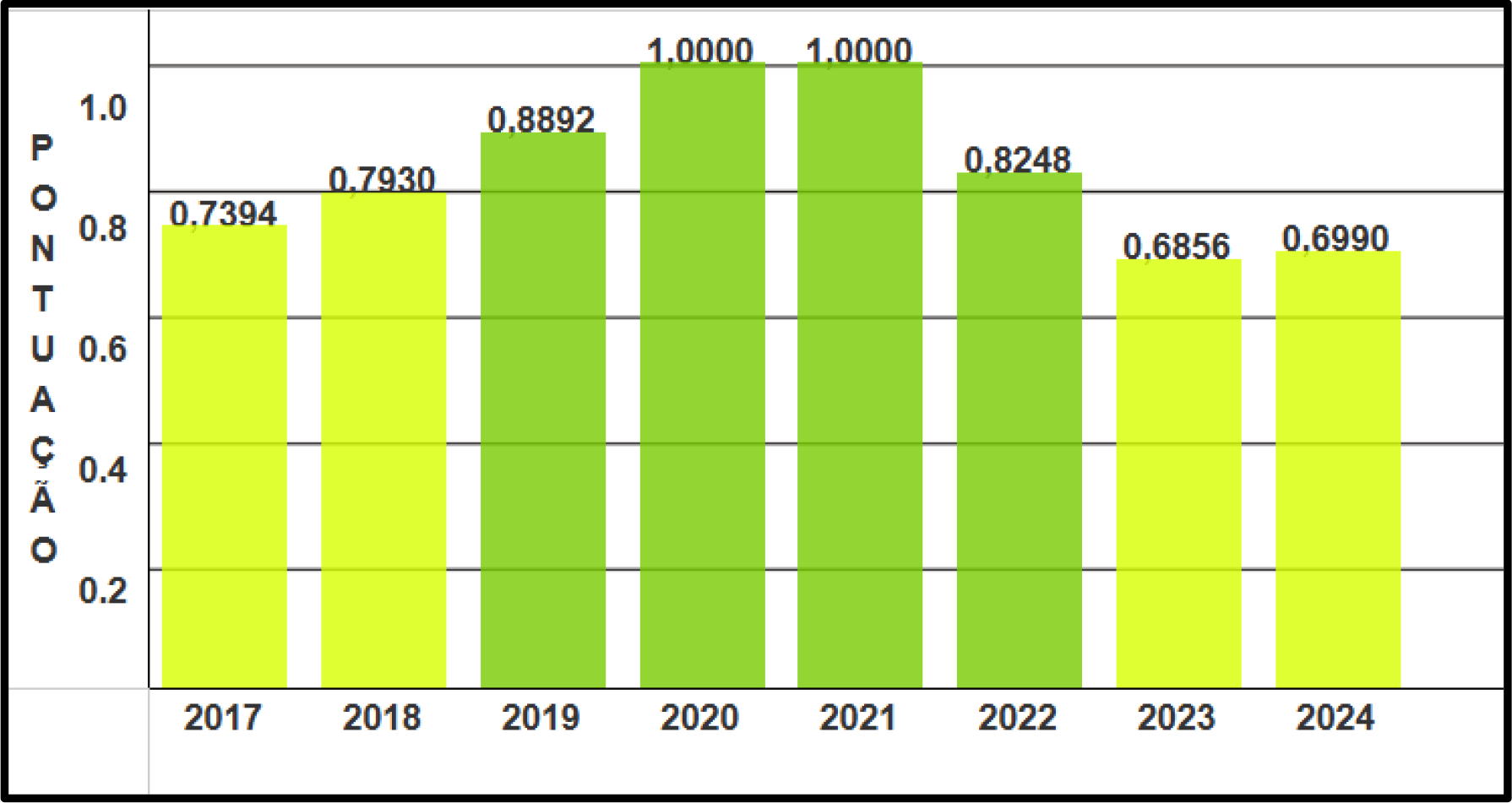 5) Gráfico de evolução do IDSS - TISS: A ANS iniciou, a partir do IDSS ano-base 2017, uma nova etapa do Programa de Qualificação, que usa o Sistema de Informação do Padrão TISS (Troca de Informações na Saúde Suplementar) como fonte de dados para o processamento dos indicadores. A metodologia foi totalmente modificada, com os indicadores calculados sobre uma base de dados nova, gerando resultados que não são totalmente comparáveis com os anos anteriores.