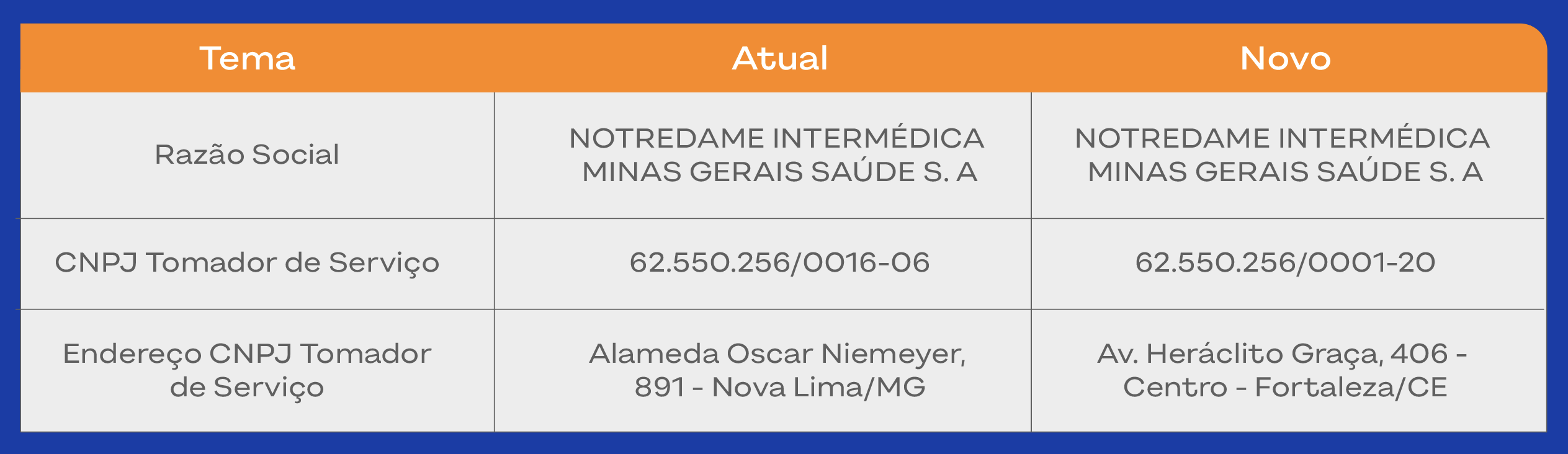 Gostaríamos de informá-los que, com o objetivo de aprimorar nossas operações e promover o crescimento contínuo da companhia, a partir de 1º de junho, o endereço do CNPJ Matriz da operadora NOTREDAME INTERMÉDICA MINAS GERAIS SAÚDE S.A. será transferido para o município de Fortaleza/CE. Com isso, as emissões de Notas Fiscais deverão ser realizadas utilizando o CNPJ Matriz da operadora.